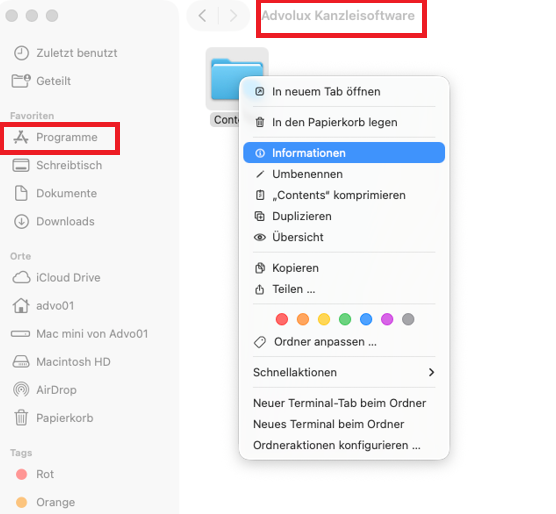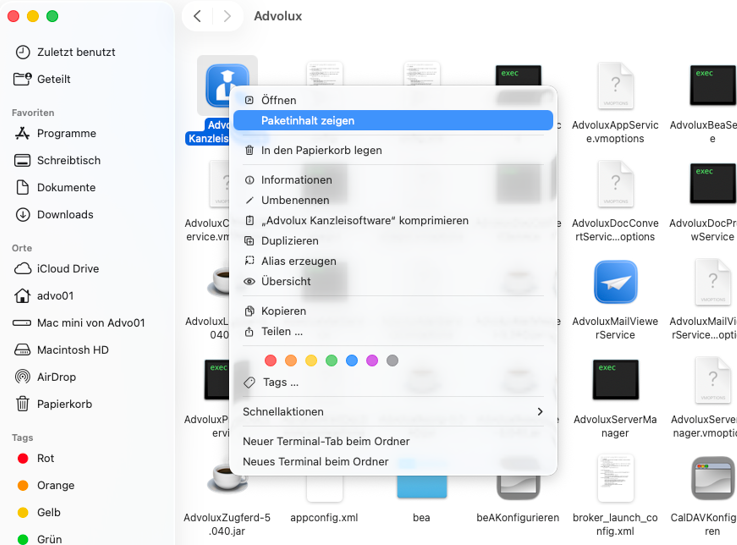 Schließen Sie Advolux. Öffnen Sie den Finder und gehen zu 'Programme/Advolux'. Klicken Sie dort mit rechts auf 'Advolux Kanzleisoftware' und wählen 'Paketinhalt anzeigen'.