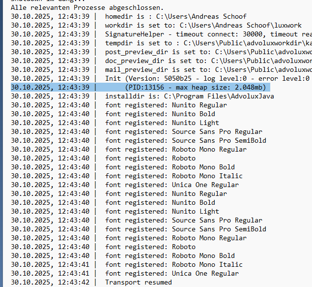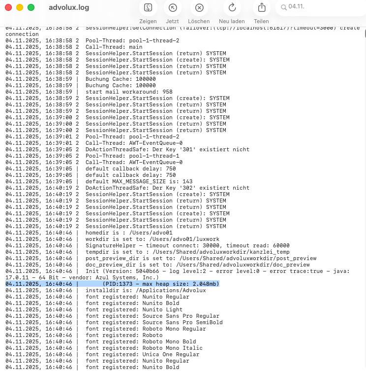 Wenn Sie nun den Advolux-Client starten, werden 2048 MB Arbeitsspeicher mitgegeben. Dies können Sie in 'Programme/AdvoluxJava/log' in der Datei 'advolux.log' sehen (siehe blaumarkierte Zeile).