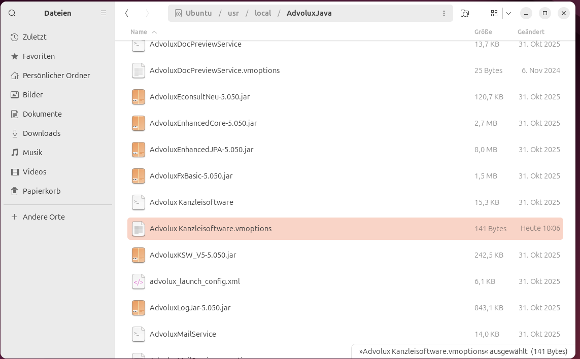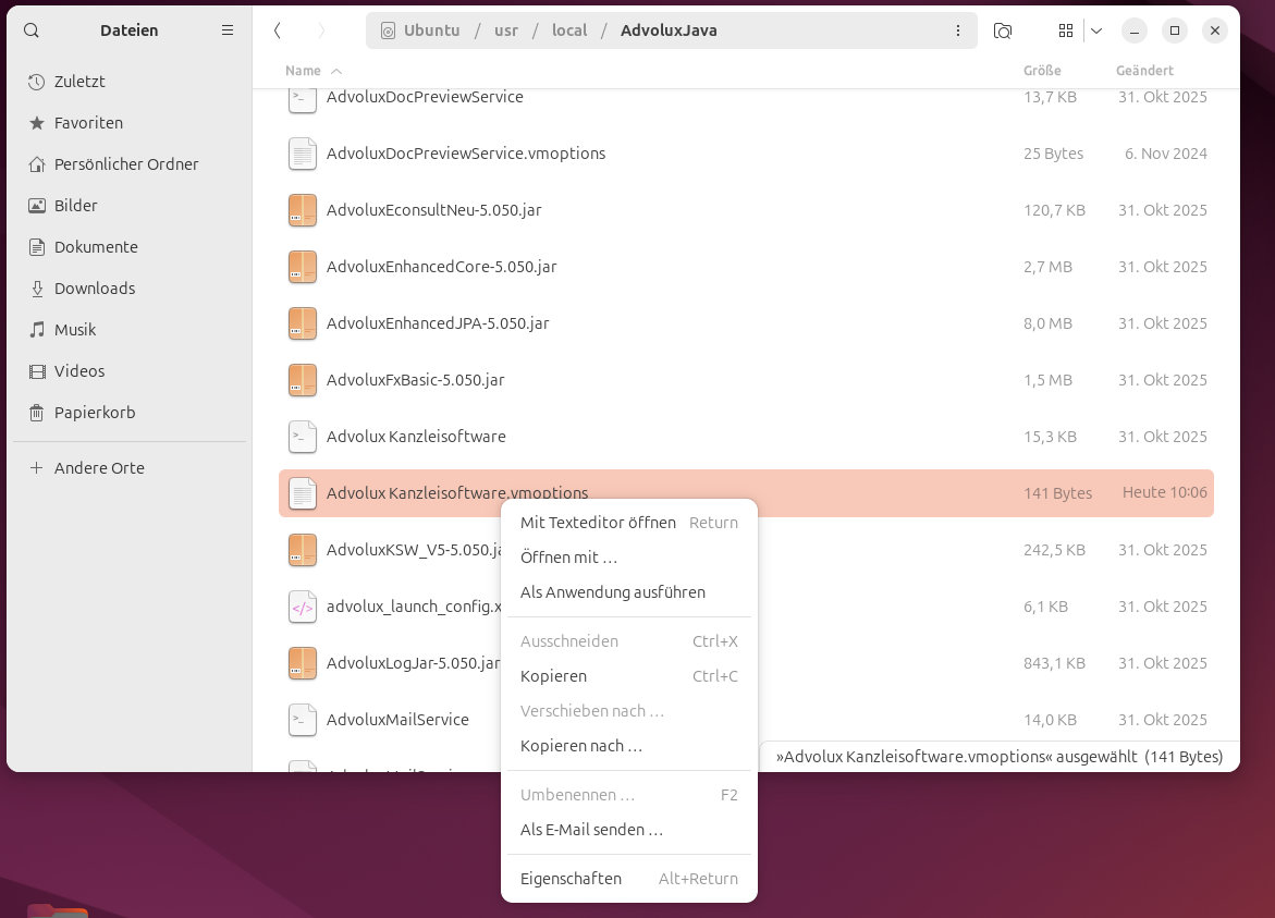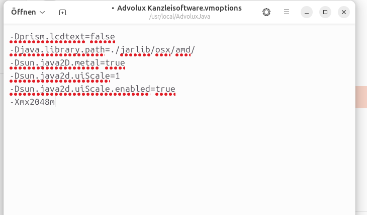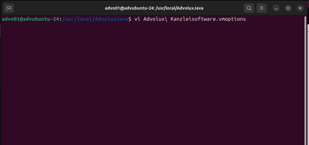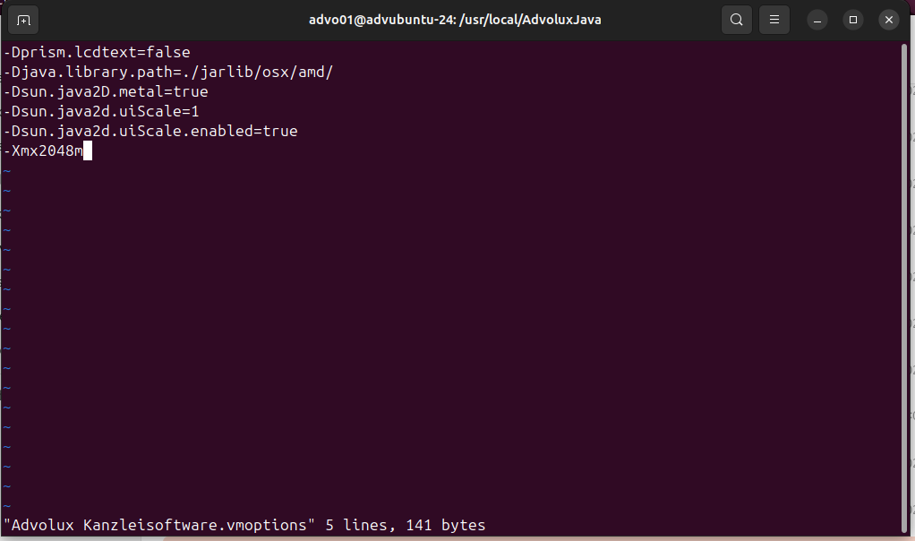 Die Datei 'Advolux Kanzleisoftware.vmoptions' befindet sich in /usr/local/AdvoluxJava (bei einer Standardinstallation).