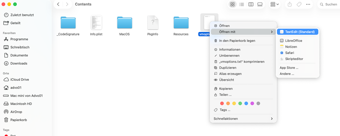 Schließen Sie das Info-Fenster und wechseln in den Ordner 'Contents'. Öffnen Sie die vmoptions.txt mit 'TextEdit'.