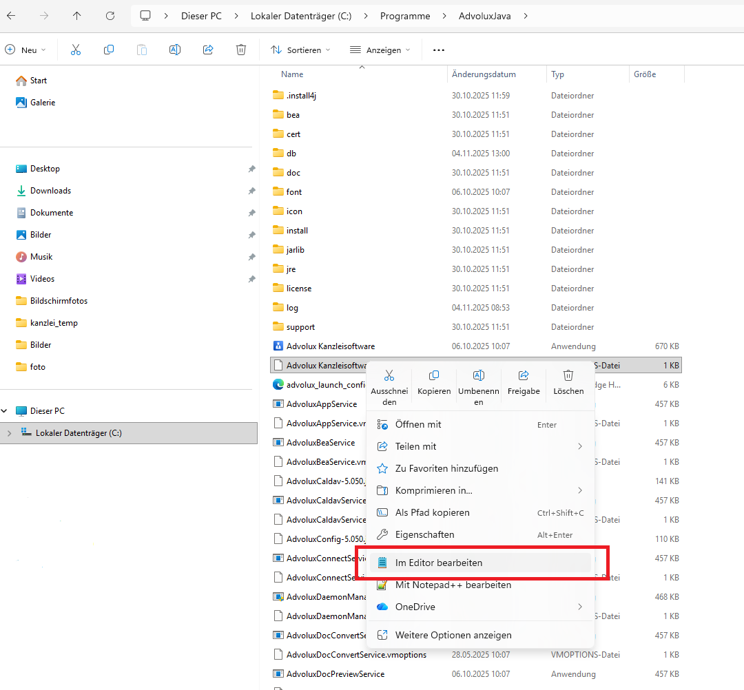 Schließen Sie Advolux. Öffnen Sie den Explorer und gehen zu 'Programme/AdvoluxJava'. Klicken Sie dort mit rechts auf 'Advolux Kanzleisoftware.vmoptions' und wählen 'Im Editor bearbeiten'.