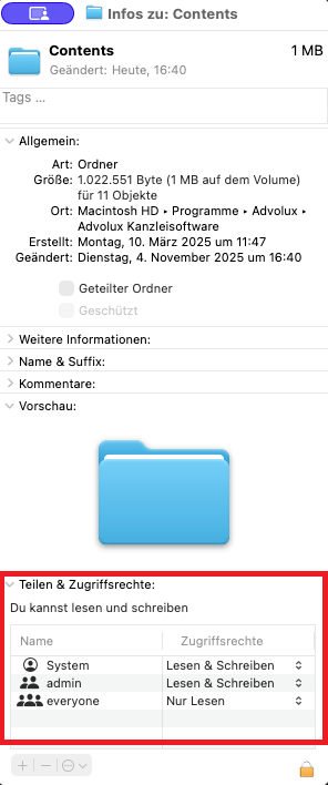 Gehen Sie mit rechter Maustaste auf den Ordner 'Contents' und wählen 'Informationen'.
