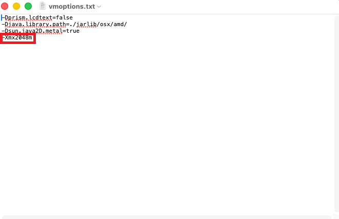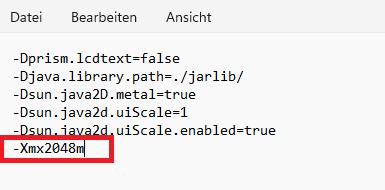 Nun können Sie mit -Xmx2048m z. B. dem Programm 2048MB Arbeitsspeicher mitgeben. Achten Sie darauf, dass die Menge Arbeitsspeicher, die Sie hier vergeben, auf dem Rechner auch verfügbar ist. Speichern Sie die Datei.