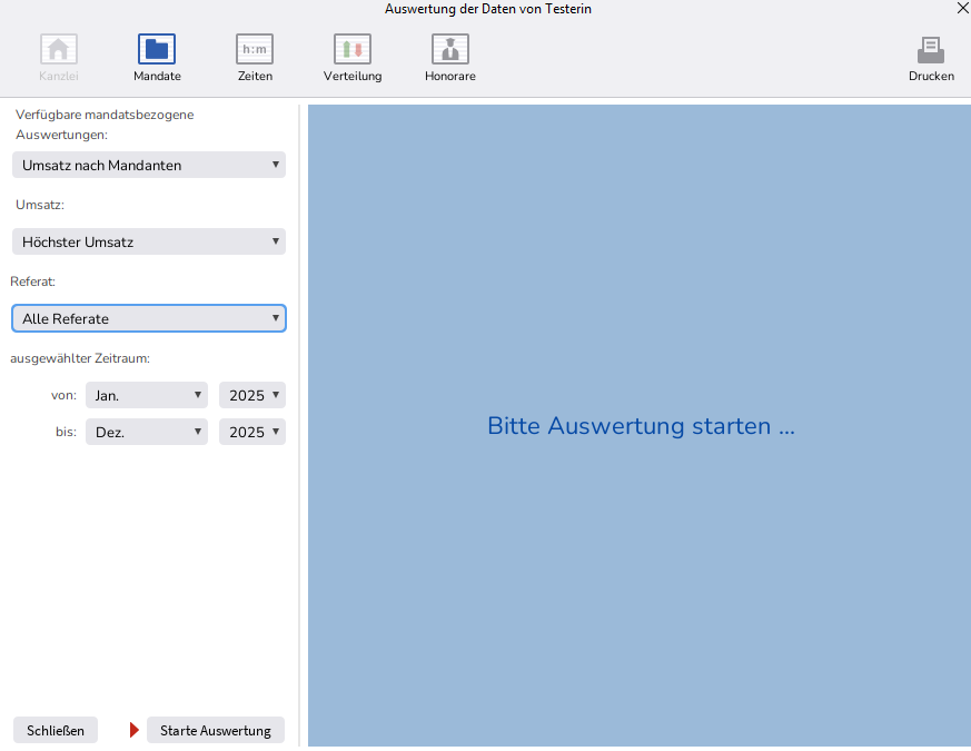 Der Reiter 'Kanzlei' ist ausgeblendet, die übrigen Auswertungsmöglichkeiten 'Mandate', 'Zeiten', 'Verteilung' und 'Honorare' sind auf die Daten der Mitarbeiterin beschränkt. Die Daten der anderen Mitarbeiter werden nicht angezeigt.