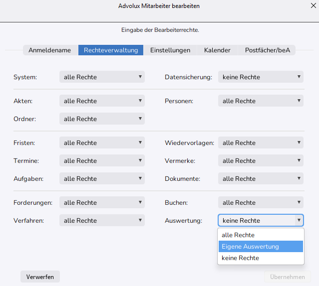 Die Berechtiungen für das Kanzlei-Controlling können so konfiguriert werden, dass der jeweilige Bearbeiter nur seine eigenen Daten sehen kann.