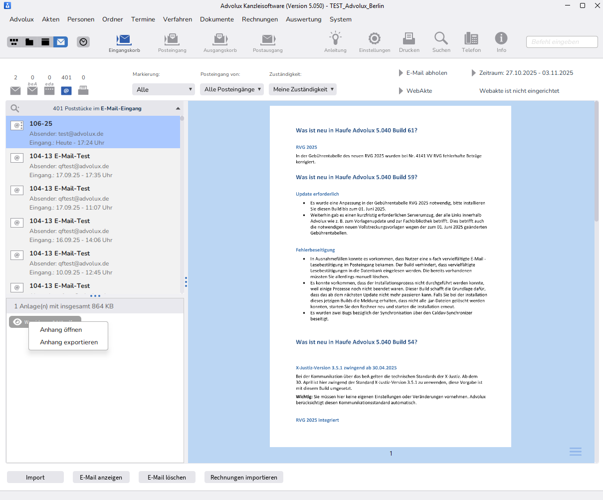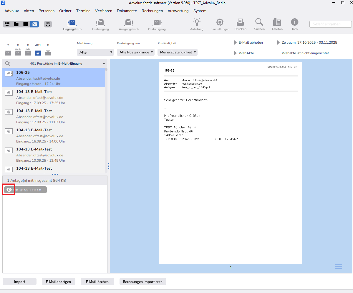 Ist die E-Mail in der Akte, kann ebenfalls mit Klick auf das Auge eine Vorschau der Anlage angezeigt werden. Weitere Aktionen wie 'Anhang öffnen', 'Anhang exportieren', 'Anhang in Akte übernehmen' oder 'Mehrere Anhänge übernehmen' sind an dieser Stelle möglich.