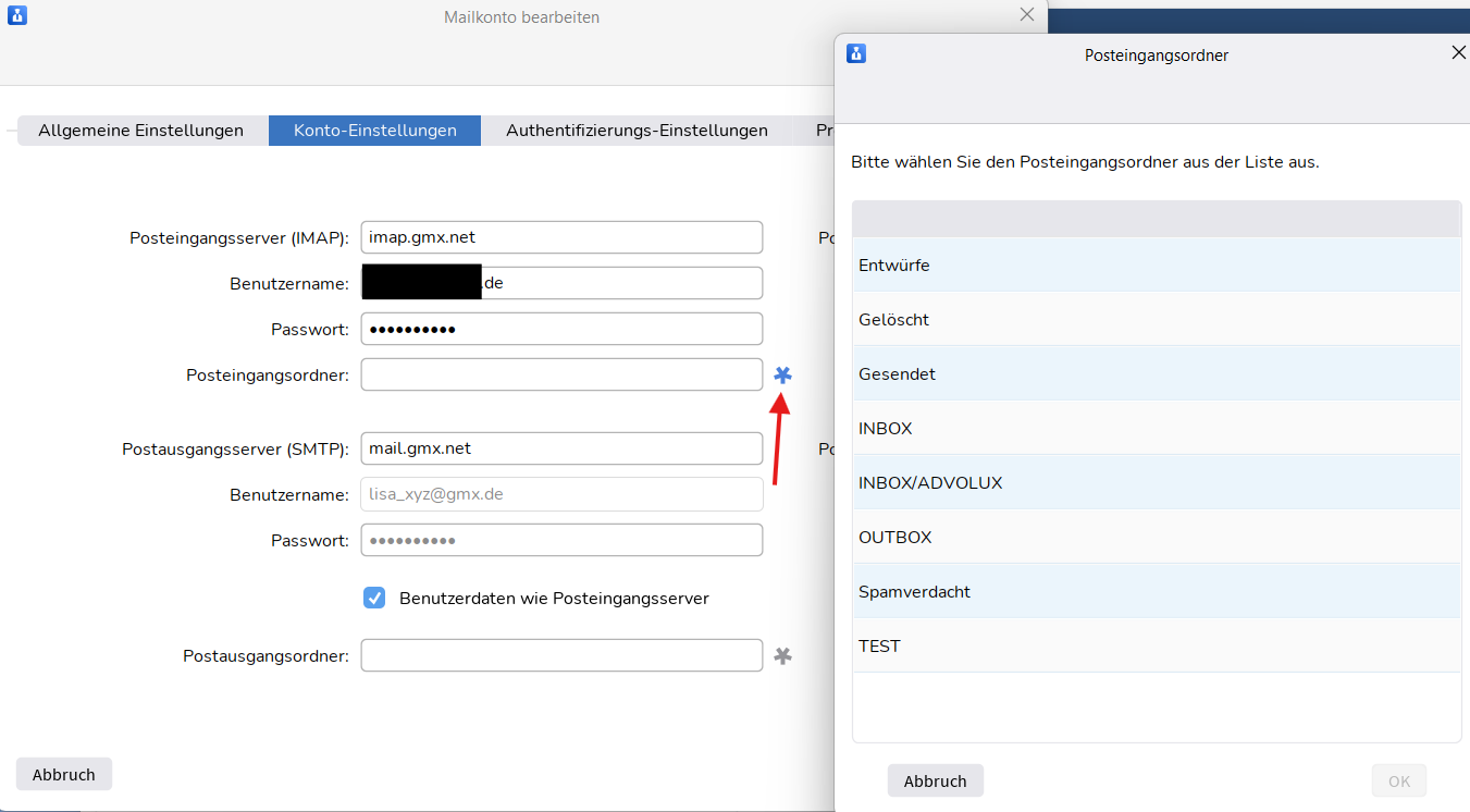 Unter den Konto-Einstellungen klicken Sie auf das kleine Sternchen. Hier können Sie nun Ihren Unterordner auswählen.