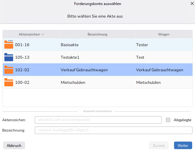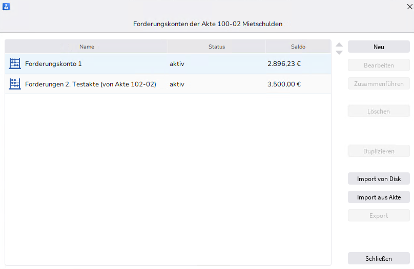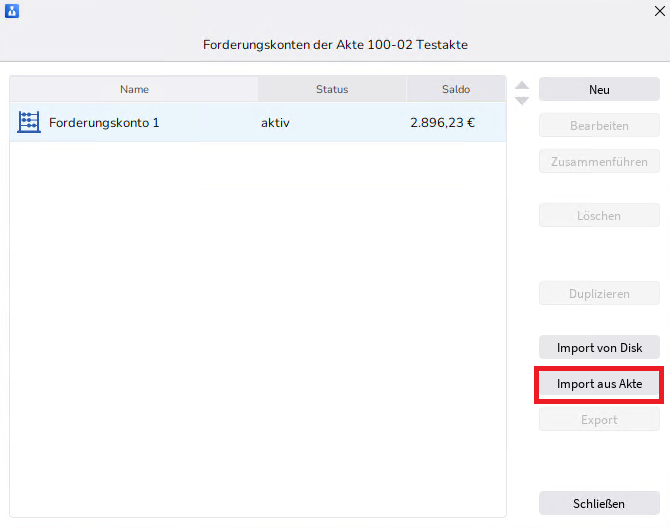 Nun ist eine Kopie des importierten Forderungskontos auch in dieser Akte vorhanden (in der alten Akte bleibt das Forderungskonto erhalten).