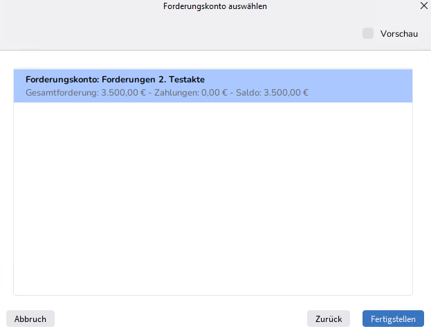 Wählen Sie das entsprechende zu importierende Forderungskonto aus und drücken auf 'Fertigstellen'.