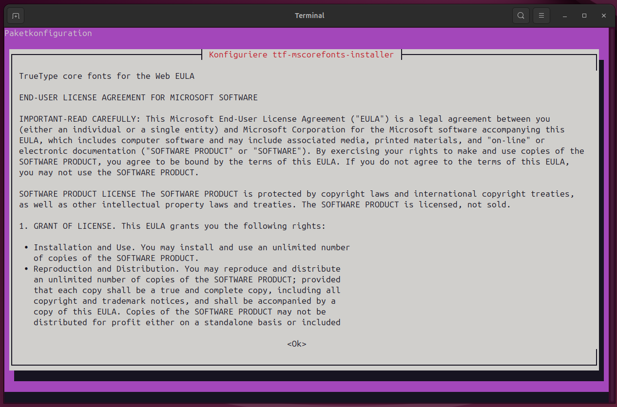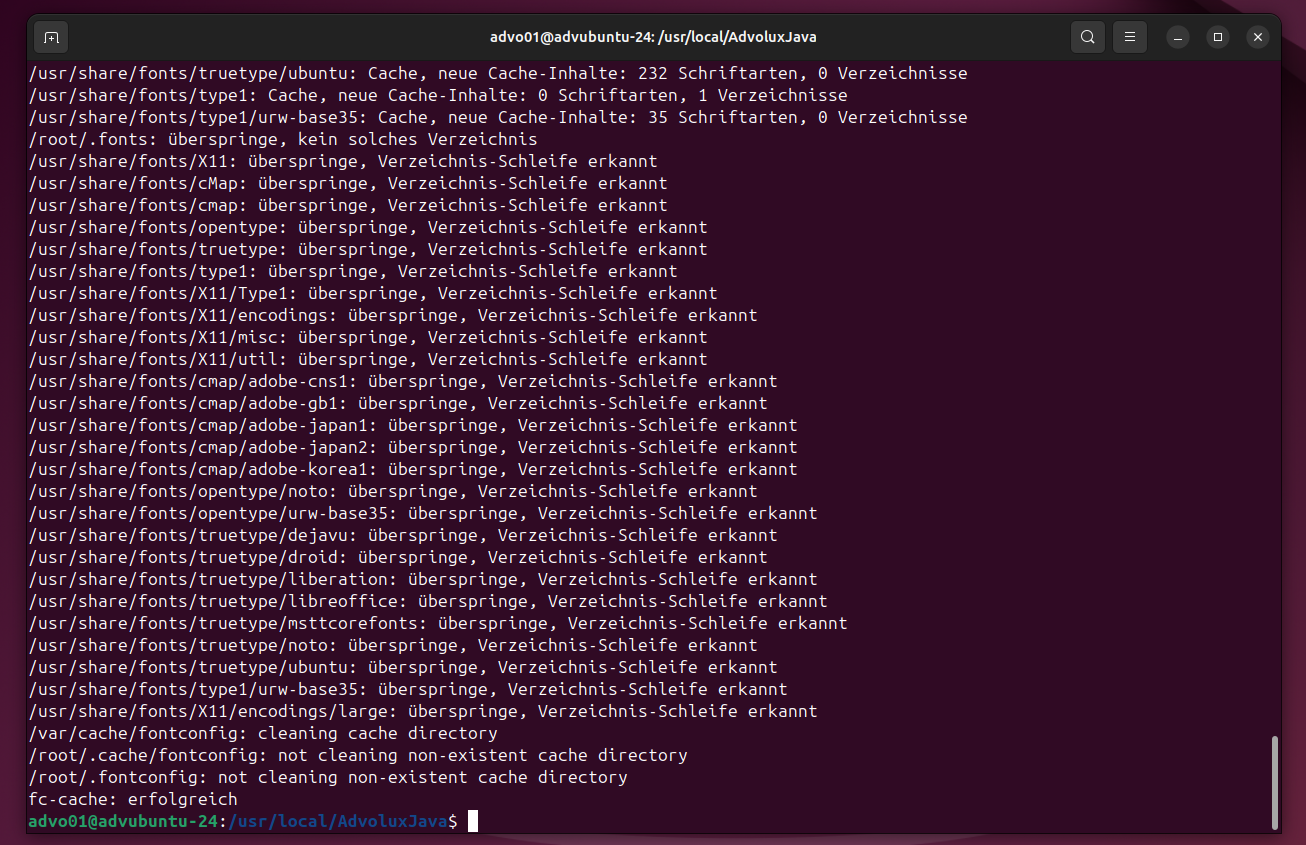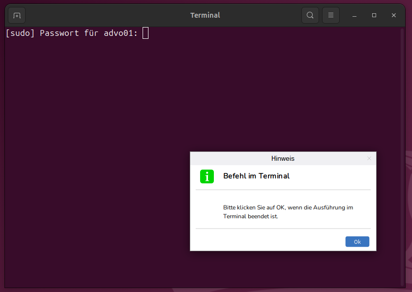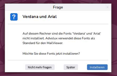 Advolux erkennt, wenn benötige Standardfonts (Verdana, Arial) auf einem Linux-Server fehlen, und bietet an, diese zu installieren. Es erscheint ein sudo-Dialog.