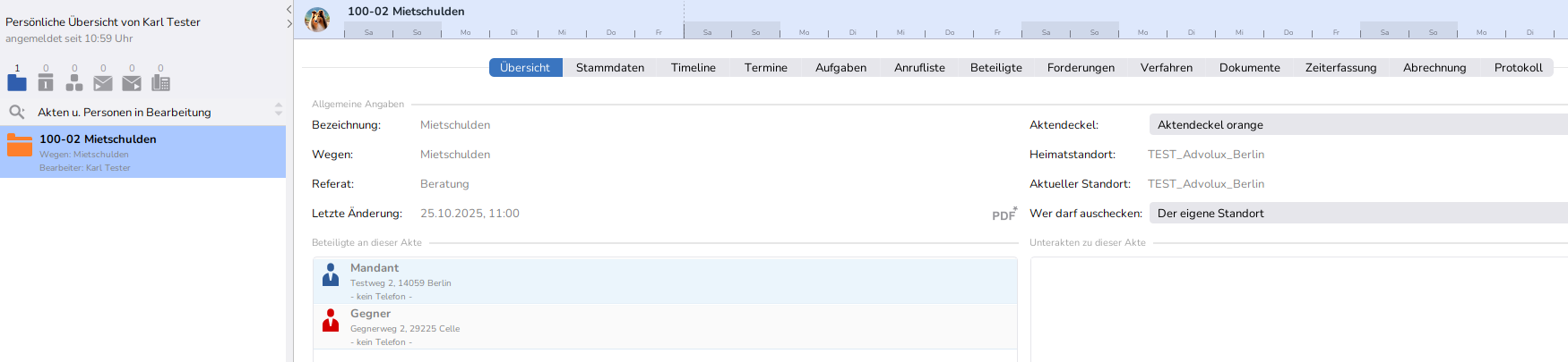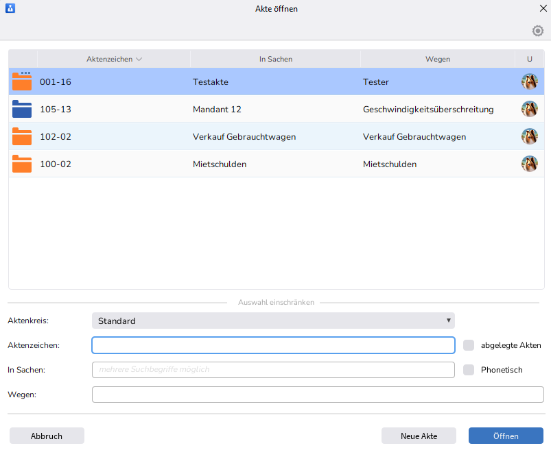 Jeder in Advolux angelegte Bearbeiter hat ein Profilbild. Standardmäßig ist das Profilbild ein farbiger Kreis mit jeweils dem ersten Anfangsbuchstaben des Vor- und Nachnamens (wenn es keinen eingetragenen Vornamen gibt, wird nur der erste Buchstabe des Nachnamens dargestellt).