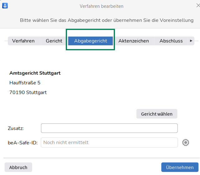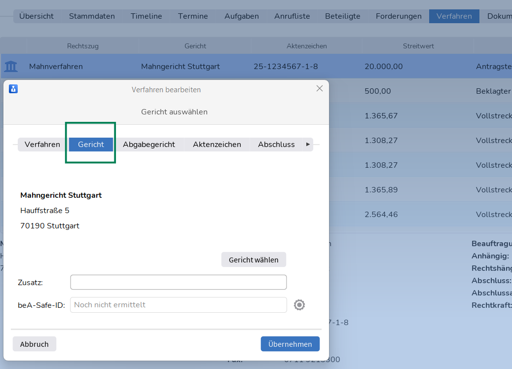 1. Unter Verfahren → Gericht muss explizit ein Mahngericht angegeben werden (kein Amts- oder Landgericht).