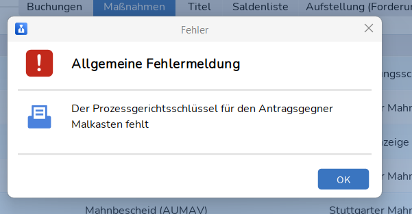 Kommt es bei Erstellung eines Mahnbescheids zu oben stehender Fehlermeldung, prüfen Sie bitte folgende Eingaben: