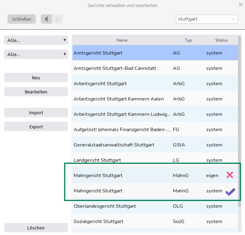 3. Sollten die Punkte 1 und 2 korrekt eingetragen sein, prüfen Sie bitter unter System - Einstellungen - Gerichte verwalten, ob eines der benötigten Gerichte doppelt vorhanden ist und löschen Sie ggf. das Gericht ohne den Zusatz 'system'.