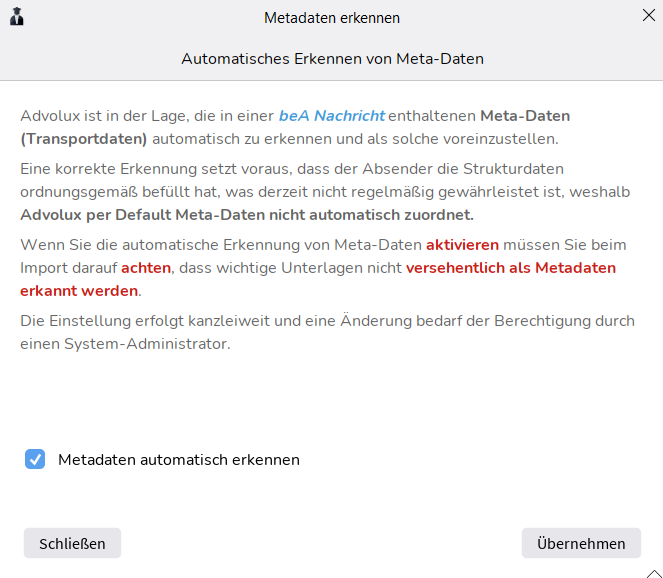 Advolux ist in der Lage, die in einer beA-Nachricht enthaltenen Metadaten (Transportdaten) automatisch zu erkennen und als solche voreinzustellen. Eine korrekte Erkennung setzt allerdings voraus, dass der Absender die Strukturdaten definitionsgemäß befüllt hat, was derzeit nicht immer gewährleistet ist. Daher haben wir uns entschieden, die ab der Version 5.000 neue bzw. verbesserte Erkennung standardmäßig abzuschalten.